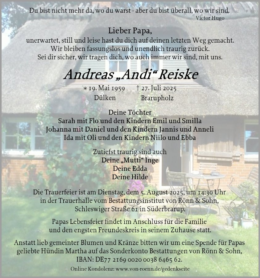 Mein aufrichtiges Beileid gilt in dieser schweren Zeit deiner Familie und besonders deinen Kindern.