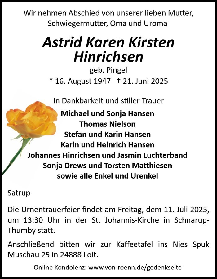 geboren am 16. August 1947 in Flarup, Gem. Saustrup gestorben am 21. Juni 2025 in Schleswig