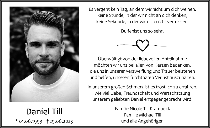 Liebe Nicole, Michael, Philipp und FamilienEs ist unsagbar schwer zu sagen was man fühlt. Daniel wird für immer in unseren Herzen bleiben. Wir sind in Gedanken bei Euch