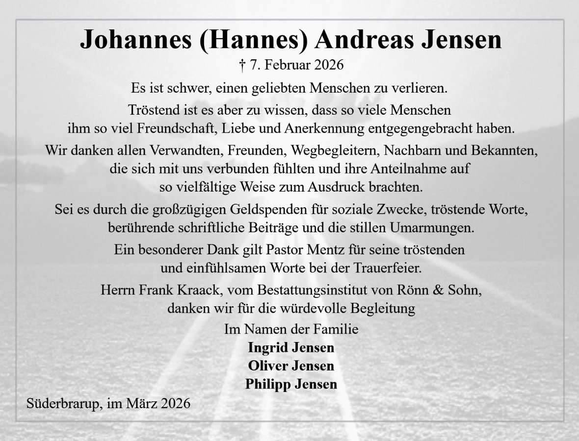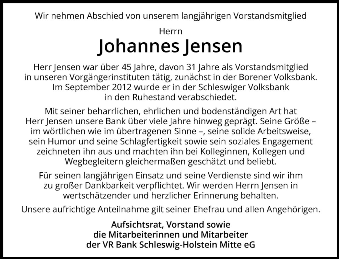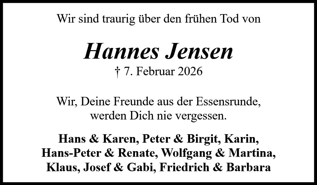 ich durfte Johannes Jensen als einen Menschen kennenlernen, der mir durch seinen besonderen Humor auffiel und seine enge Bindung zur Familie, deren Tun er aufmerksam und liebevoll verfolgte. Ein Familienmensch, der Ihnen sicher sehr fehlen wird.