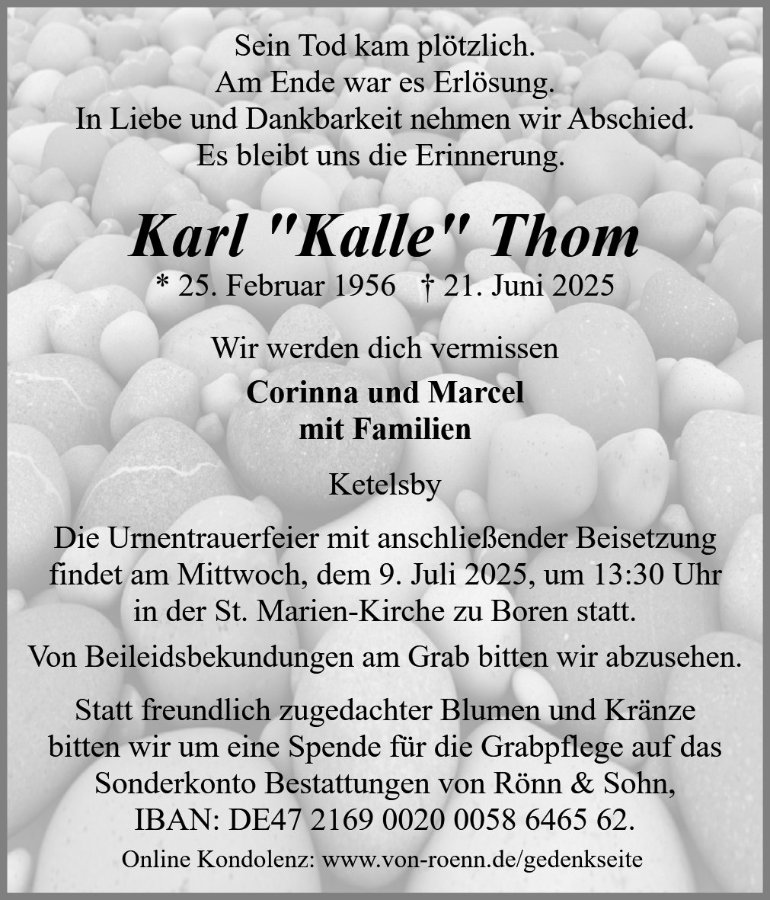 Unser herzlichstes Beileid. Wir werden die Gespräche mit Kalle beim Osterfeuer bzw Feuerwehrfest vermissen. Jetzt ist er bei seiner Ellen, die viel zu früh von unsgegangen ist.