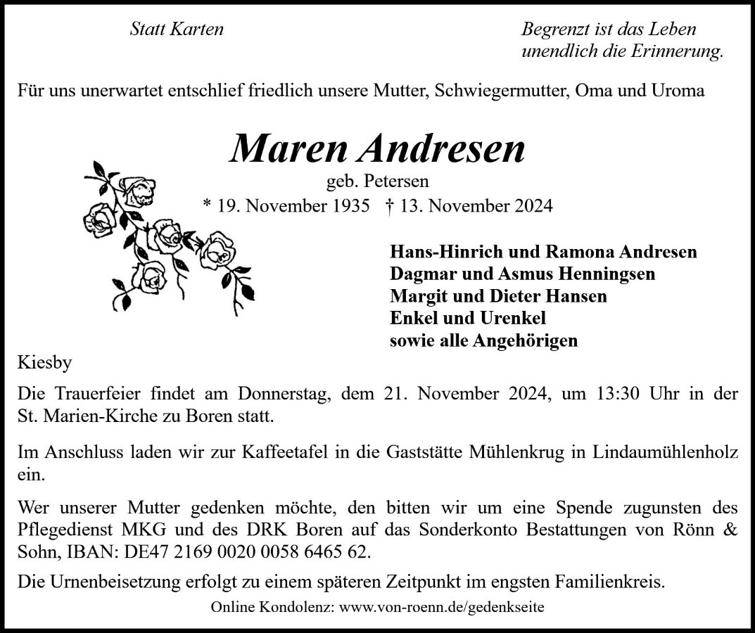 wir wünschen Ihnen für die kommende Zeit viel Kraft und dass es Ihnen gelingt, dankbar auf die positiven Erinnerungen zurückzublicken. Diese Gedenkseite möge Ihnen dabei helfen, Ihre Trauer zu teilen und das Andenken gemeinsam wachzuhalten.