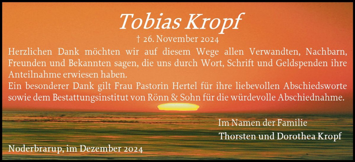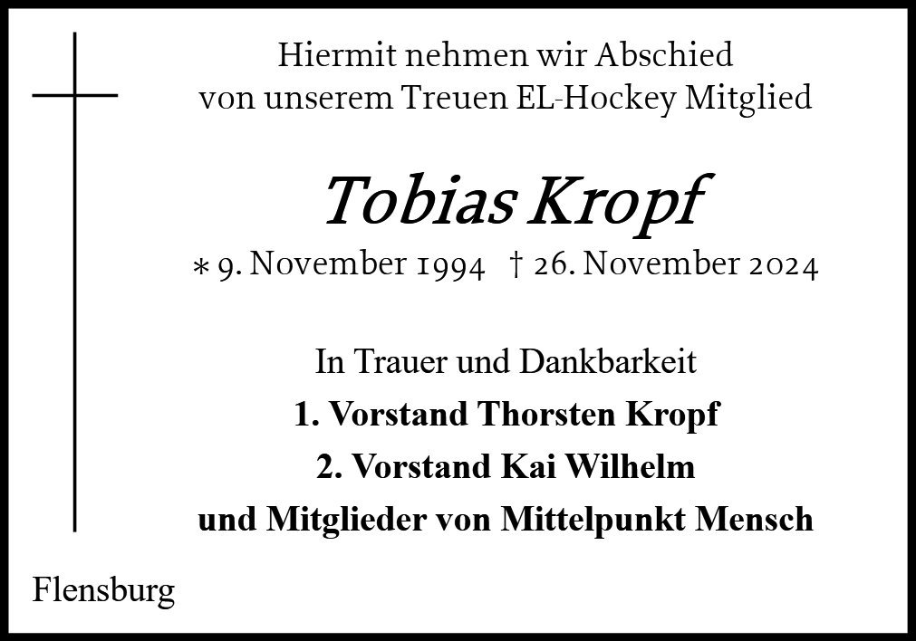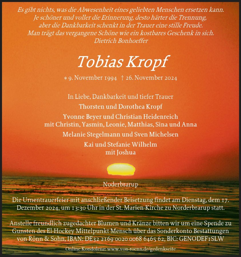 Liebe Thea und lieber Thorsten, ich möchte euch unser herzliches Beileid aussprechen. Es ist immer viel zu früh, wenn einer von den Jungs gehen muss, und das macht unendlich traurig. Ihr habt Tobias über all die Jahre und bis zum Schluss ein erfülltes und reiches Leben inmitten einer großen Familie geschenkt. Möge euch dieser Gedanke ein Trost sein in dieser schweren Zeit. Alles Liebe, Christiane und Jan-Philipp, ehemaliger Teamkollege bei den Lions